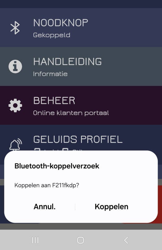 Druk de noodknop in en houdt deze ingedrukt. Kijk op de telefoon of er een ‘Koppelverzoek'